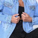 Camisa jeans clara com aplicações em pedrarias.