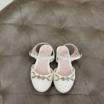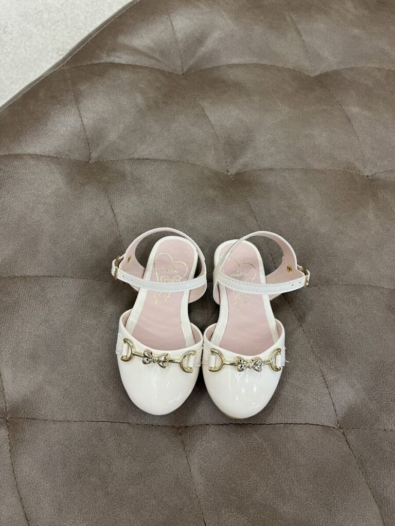 Sapatilha bege com laço dourado, infantil.