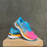 Tênis gel-meteora feminino, azul e rosa.